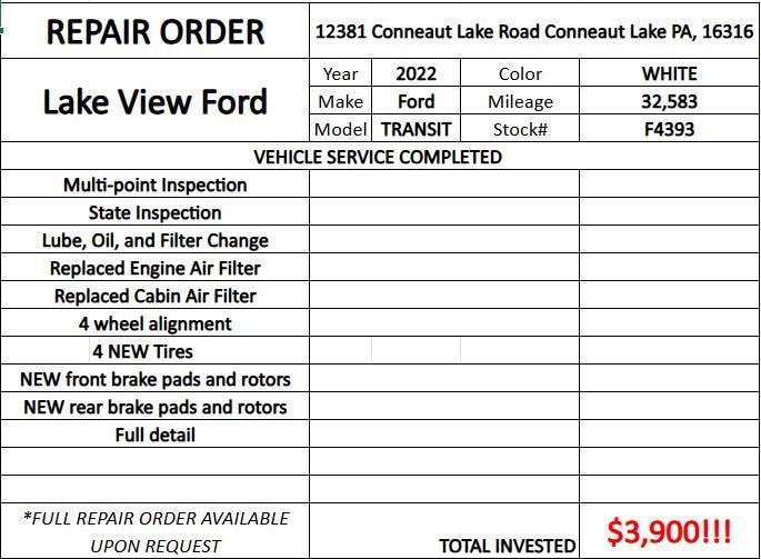 This 2022 Ford Transit Cargo Van BASE has a beautiful Oxford White exterior with Dark Palazzo Gray interior. This vehicle has 32,583 miles has been thoroughly inspected by our factory trained service technicians and has been fully reconditioned for immediate delivery. We're happy to provide this Transit Cargo Van's CARFAX vehicle history report upon request as well.