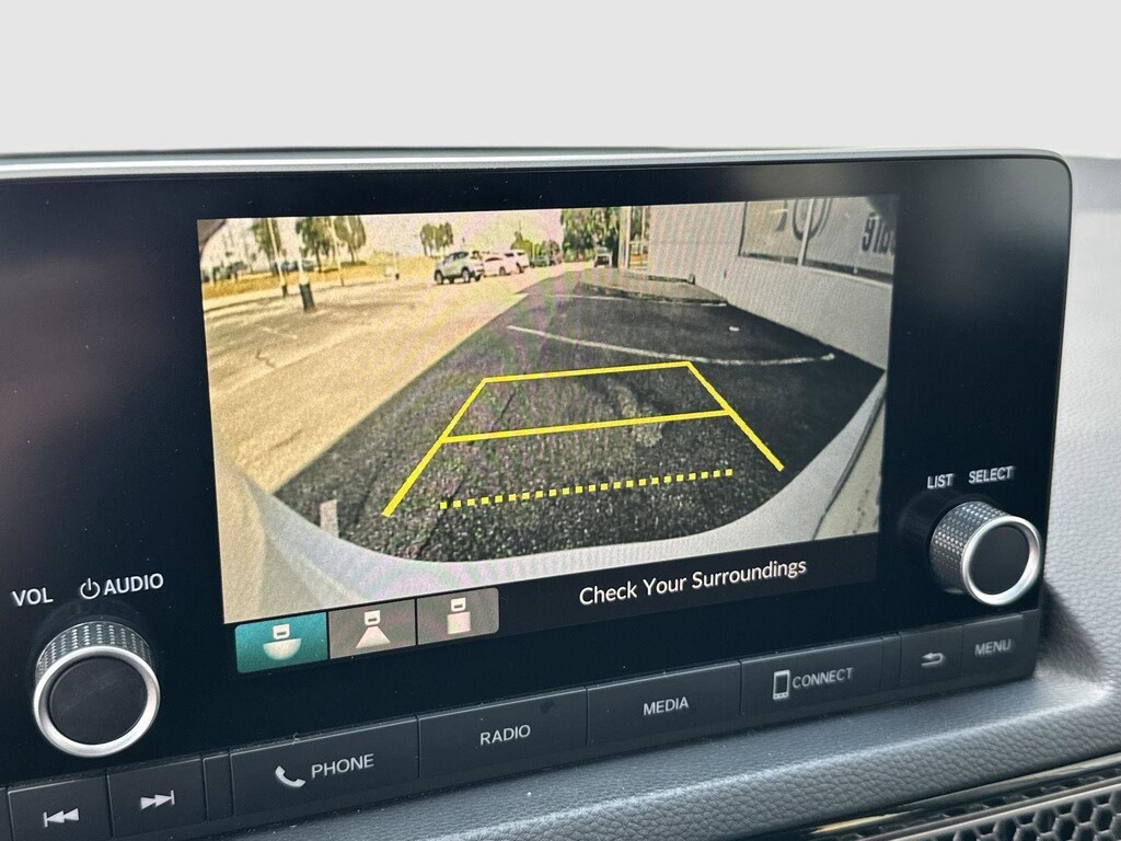 - The vehicle is equipped with a camera that displays an image of the area behind the vehicle on an interior display.